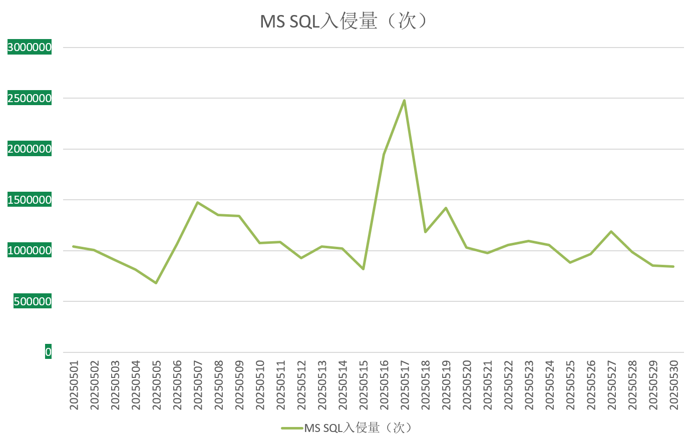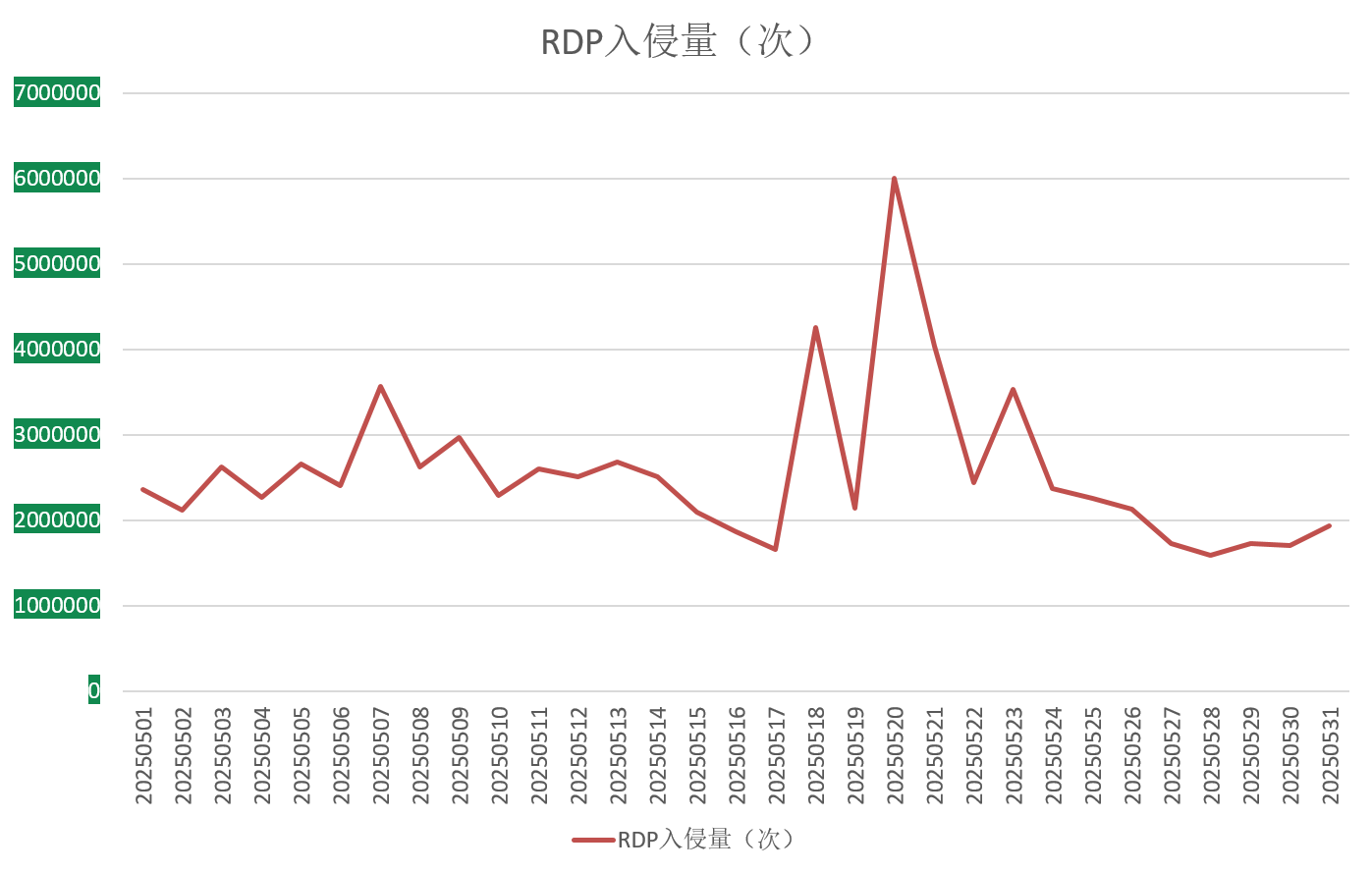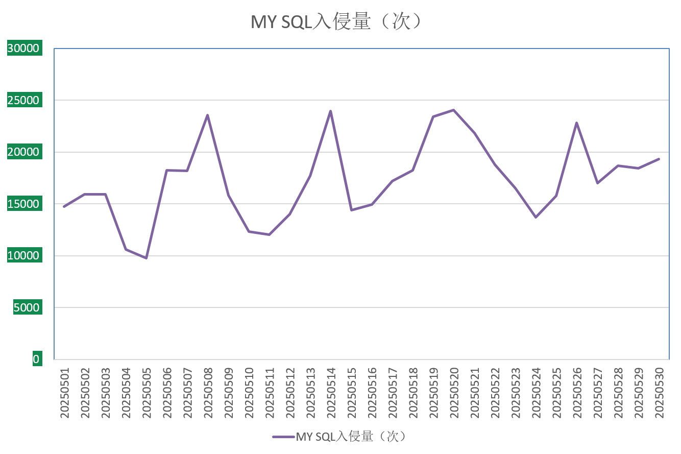 通过观察2025年5月弱口令攻击态势发现,RDP弱口令攻击、MYSQL弱口令攻击和MSSQL弱口令攻击整体无较大波动。