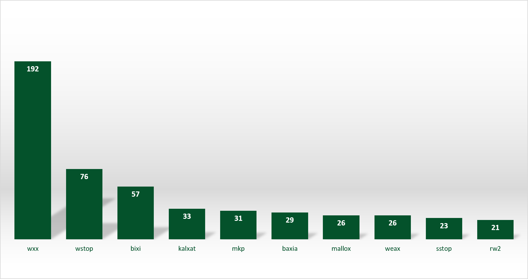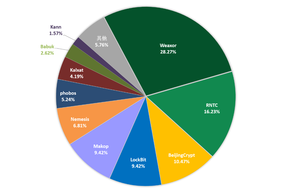 针对本月勒索软件受害者设备所中病毒家族进行统计:Weaxor家族占比28.27%居首位,第二的是RNTC占比16.23%,BeijingCrypt家族以10.47%占比位居第三。