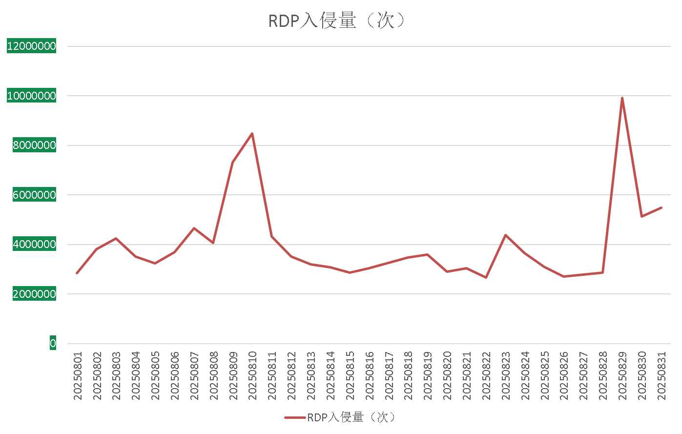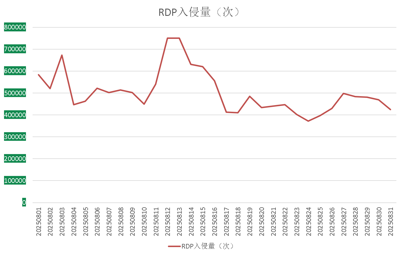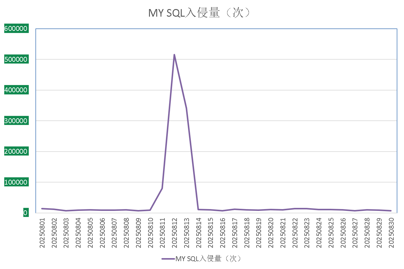 通过观察2025年8月弱口令攻击态势发现,RDP弱口令攻击、MYSQL弱口令攻击和MSSQL弱口令攻击整体无较大波动。