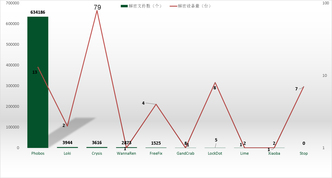 从解密大师本月解密数据看,解密量最大的是Phobos,其次是Loki。使用解密大师解密文件的用户数量,最高的是被Crysis家族加密的设备。